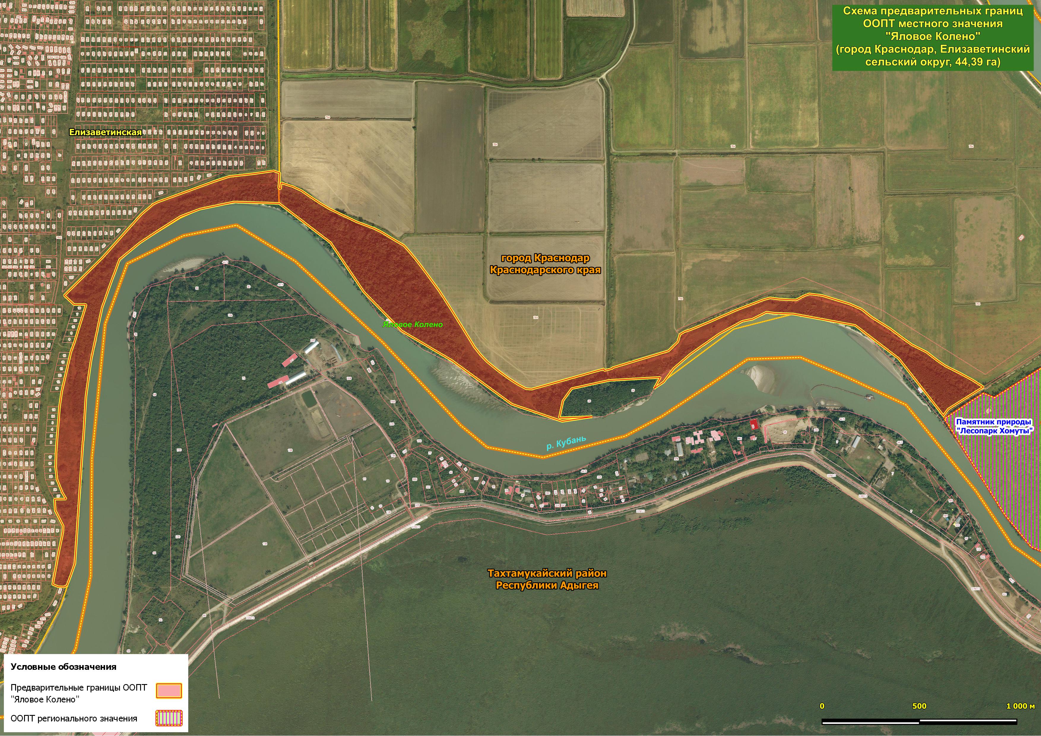 Потенциальная ООПТ регионального значения "Яловое колено" (площадь 44,39 га) к югу от станицы Елизаветинской представляет собой отличного качества лесной массив, состоящий из трёх частей, кроме того, в западной части находится большой плавневый участок. По краю леса проходит дамба с гидротехнической дорогой вдоль всего массива. На прибрежной террасе реки Кубань представлен ландшафт естественного леса с подсадками: произрастают клён, дуб, тополь белый и чёрный, вдоль берега ива, кустарники бузина чёрная и в изобилии аморфа кустарниковая. В травяном поясе отмечены вероника плющелистная, купырь бутенелистный, гравилат городской, фиалка белая, полевица малая, пролеска сибирская. На маршруте участники выезда видели следы енота-полоскуна, зайца-русака и лисицы; из птиц были различимы те же виды, что и на территории описанного выше Нижнехомутовского кута, а также фазан, вальдшнеп и серая цапля. Проходимость территории в целом хорошая, кроме зарослей аморфы; мусор встречается спорадически, особенно в местах отдыха людей. Из антропогенных угроз наиболее пагубной для экосистемы колена представляется застройка его плавневой части, в том числе рекреационными объектами.