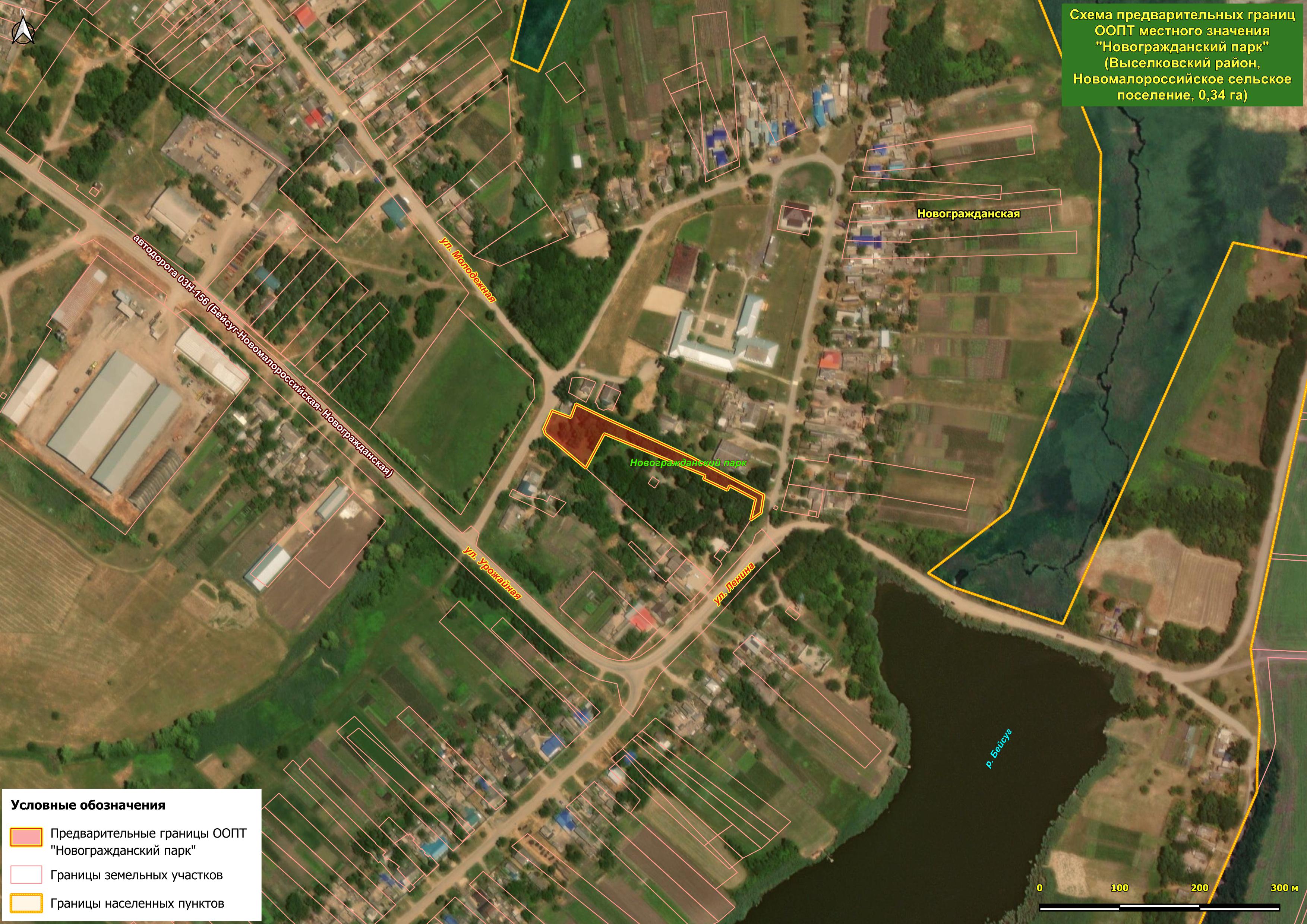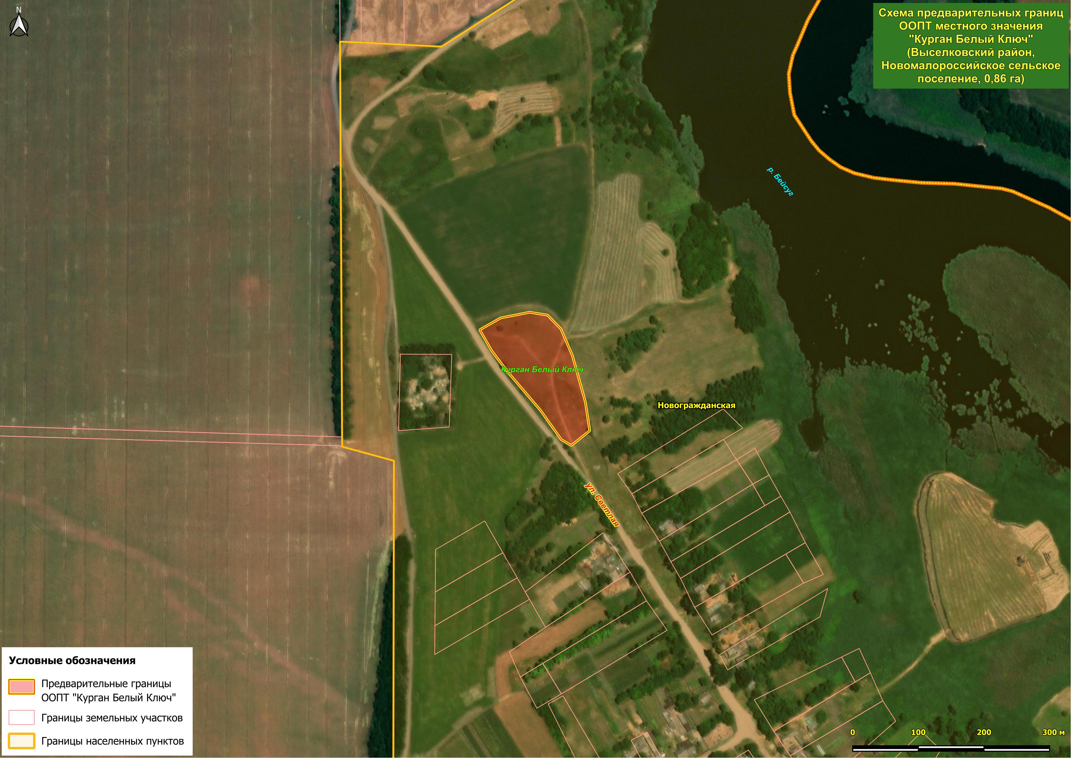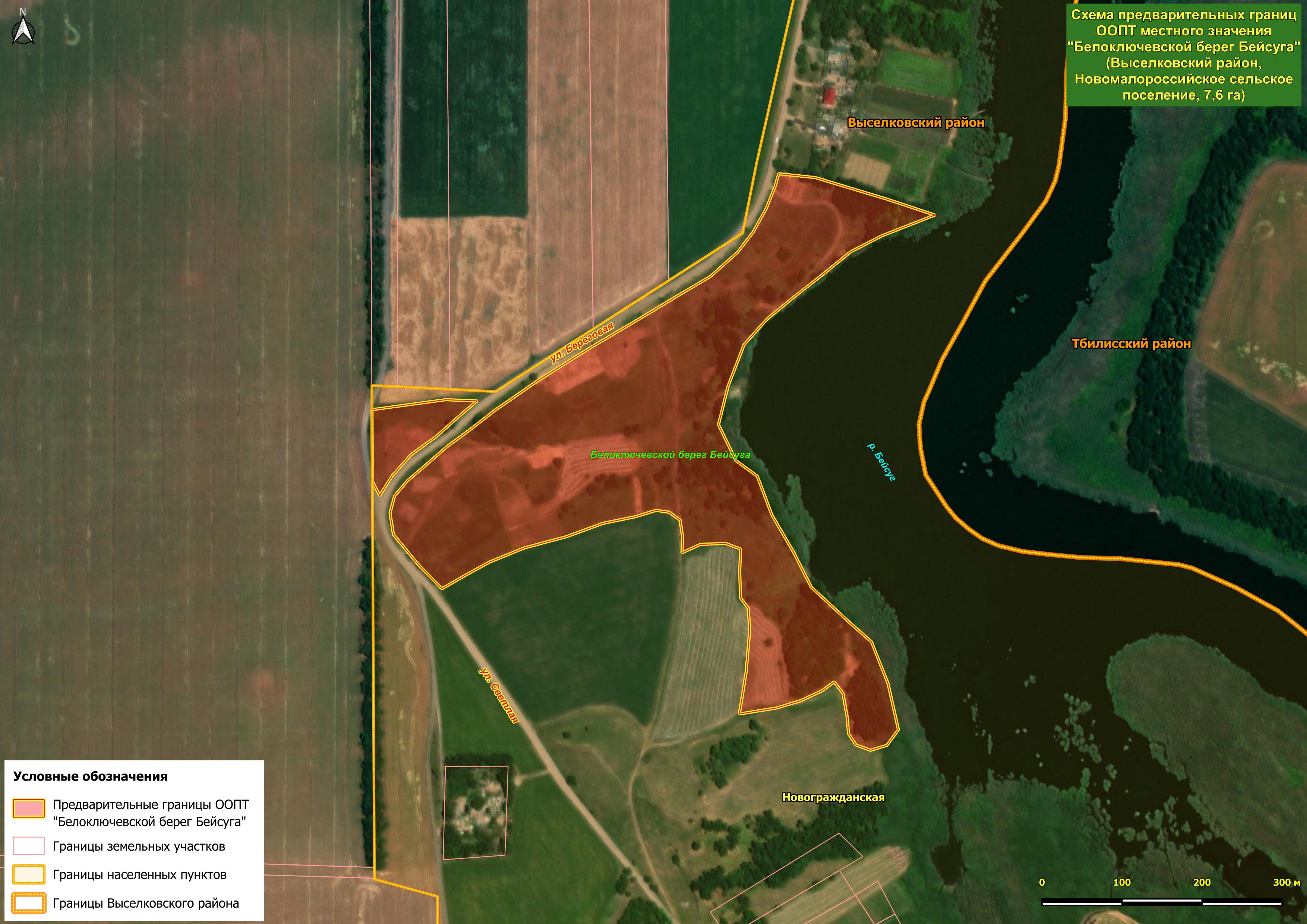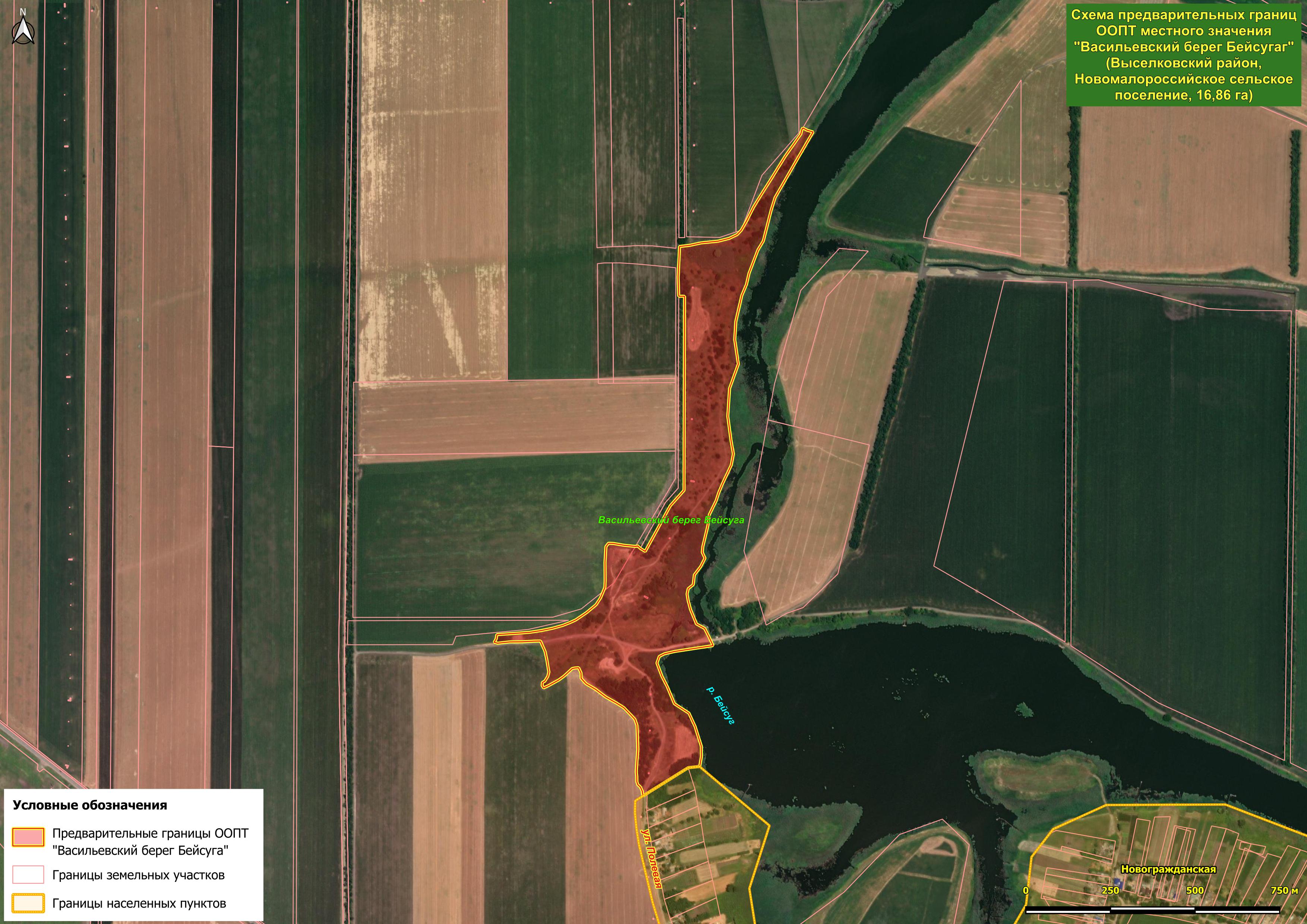 На левом берегу Бейсуга расположены и два ценных участка сохранившихся коренных степных ландшафтов высоких речных берегов – потенциальные ООПТ местного значения "Белоключевской берег Бейсуга" (площадь 7,6 га) и "Васильевский берег Бейсуга" (площадь 16,86 га). Первая из этих озеленённых территорий расположена в южной части станицы Новогражданской, в хуторе Белый Ключ, и отличается хорошим качеством естественного ландшафта, хотя местами и деградировавшего. Изюминкой этого места оказались бьющие из земли 5-7 ключей, которые сливаются в один ручей, примерно через 20 метров впадающий в Бейсуг. "Васильевский берег Бейсуга" к северу от той же станицы, на месте бывшего хутора Васильев, разделён балкой и состоит из трёх кластеров. Здесь представлен естественный степной с примесью древесных видов тип ландшафта. Из древесных видов отметим тёрн, яблоню, алычу, абрикос, ясень пенсильванский и проникающие из близлежащей лесополосы робинию лжеакацию и гледичию трёхколючковую. Много здесь и кустарников: бузина чёрная, свидина южная, жостер слабительный, а также занесённые в Красные книги миндаль степной и в изобилии крупная карагана кустарниковая.