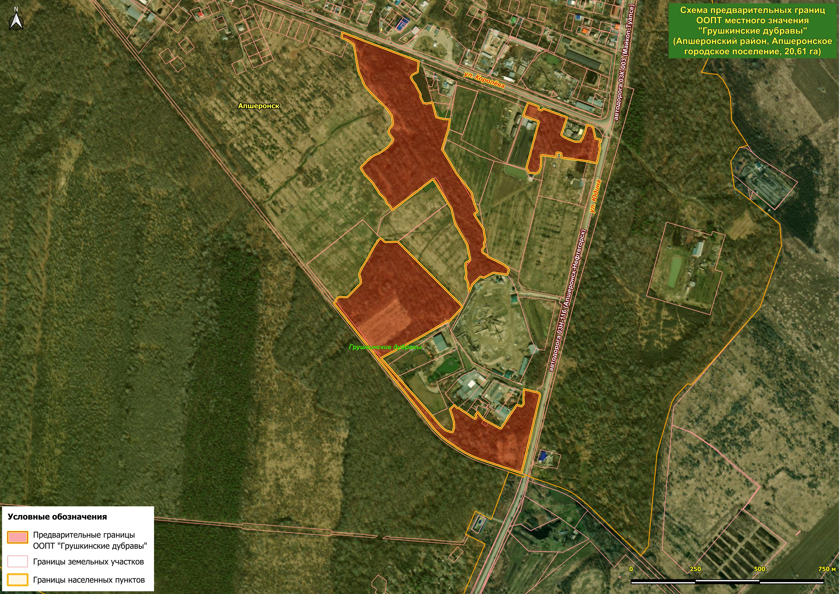 Интересна ситуация с потенциальной ООПТ "Грушкинские дубравы" (площадь 20,61 га), которая находится на юго-восточной окраине города Апшеронска, в долине реки Пшеха, и представляет собой четыре дубравы на ровном рельефе, перемежающиеся полями и промышленными зонами. Дубравы высокобонитетные, старовозрастные, деревья дуба черешчатого высокие и прямоствольные. Кроме того, там произрастают граб обыкновенный, ясень обыкновенный, клён полевой, груша кавказская, яблоня восточная, довольно высокие, многоствольные экземпляры клёна татарского, боярышник однопестичный и пятипестичный; кустарники кизил, свидина, бересклет европейский, лещина обыкновенная. Местами встречаются довольно плотные пятна ежевики кавказской и плюща кавказского. Из трав отмечены осоки, фиалки, примула, живучка ползучая, яснотка пятнистая, клевер ползучий, местами бодяк полевой, краснокнижные морозник восточный и цикламен кавказский, на деревьях встречается омела; обнаружен гриб трутовик лаковый. Крупных водных объектов здесь нет, есть неглубокие балки с временными водотоками. К территории примыкают пахотные и сенокосные поля, с восточной стороны - промзона с площадкой для хранения инертных материалов. Люди используют эти красивые и в целом хорошо проходимые дубравы для отдыха и сбора плодов. В обследовании этой территории принимал участие фермер Григорий Перепелица, который переживает за сохранение участков коренных дубовых лесов и поддерживает создание здесь охраняемой территории.Инф. Экологической Вахты по Северному Кавказу