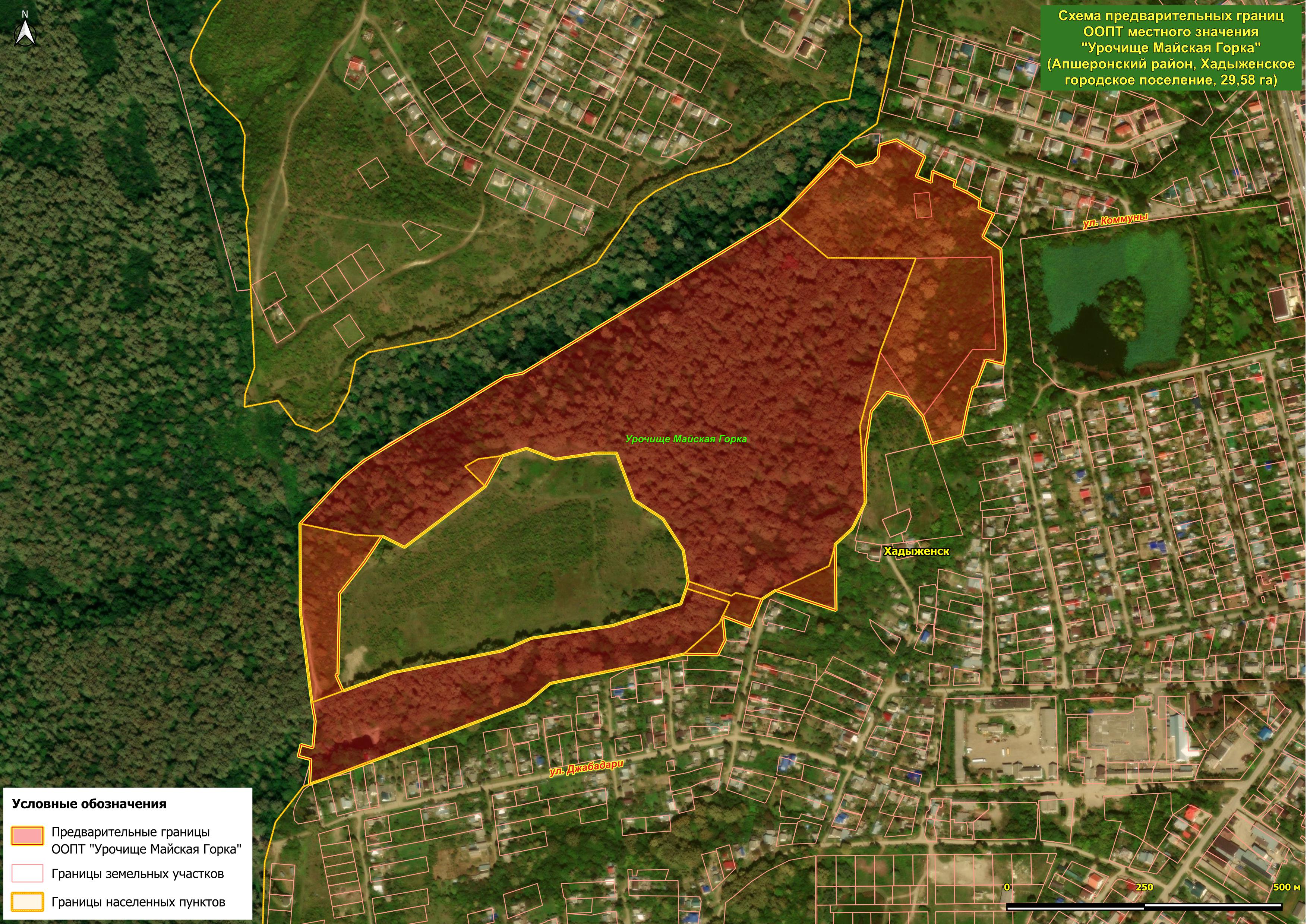 Перспективная ООПТ "Майская горка" (площадь 29,58 га) примыкает к городскому парку Хадыженска, окружающему озеро Майское. Нижняя склоновая часть обследованной территории заросла дикими плодовыми (боярышник пятипестичный, яблоня, груша), также там произрастают ясень обыкновенный, клён полевой, из трав интересно пятно краснокнижного цикламена кавказского; там же был обнаружен травмированный уж. Выше появляются дуб черешчатый, граб обыкновенный; наверху - платообразный рельеф, там растут крупные раскидистые вековые деревья дуба черешчатого, граб обыкновенный, боярышник однопестичный и пятипестичный, яблоня, груша, кизил, ясень, клён полевой и каппадокийский, клён татарский, отдельные экземпляры пихты кавказской и бука восточного; из кустарников свидина. Из трав отмечены плющ кавказородный, фиалка, яснотка пурпурная, зеленчук, буквица лекарственная, козлятник восточный, зверобой, девясил, чистец лесной, осоки; обнаружено несколько видов грибов (сыроежка розовая и другие). То есть на основной части территории ландшафт естественный, это коренной низкогорный преимущественно дубовый лес. Поляны зарастают дикими плодовыми, ежевикой священной, ситником и другой мочаковой растительностью. Дороги и тропиночная сеть на территории есть, люди используют её для прогулок и сбора грибов и плодов плодовых деревьев; по одной из троп видны следы мотоциклов. Антропогенные угрозы типичны для природных зон вблизи населённых пунктов: вырубка, застройка, организация свалок, а также низовые пожары.