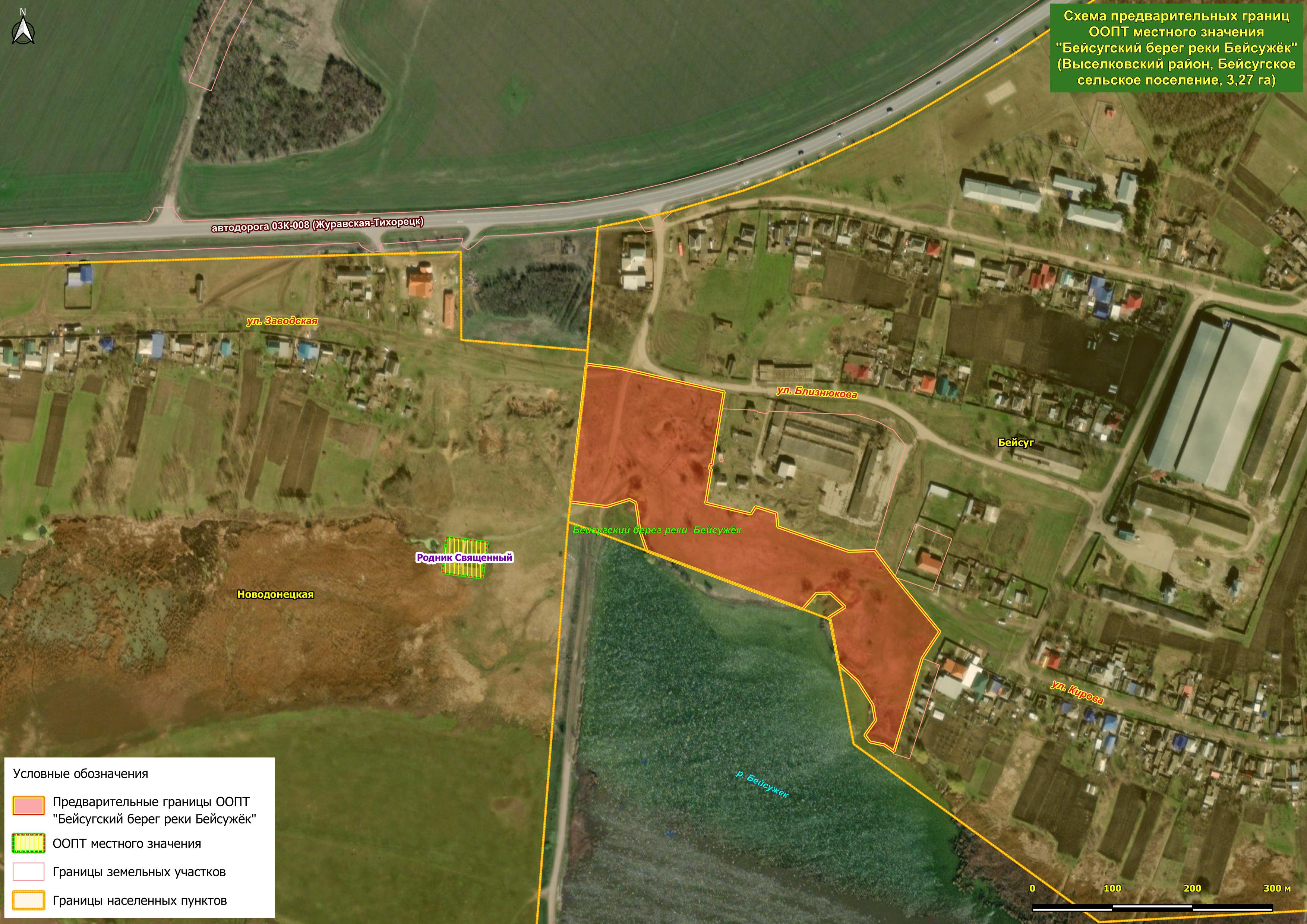 Как пример одной из перспективных зелёных зон в Выселковском районе рассмотрим "Бейсугский берег реки Бейсужёк" (площадь 3,27 га), который находится в западной части посёлка Бейсуг и представляет собой склоновую территорию на высоком берегу крупного правого притока Бейсуга. Здесь представлен ландшафт антропогенно трансформированного степного берега с участком пойменного луга. Рельеф неровный, возможно, кое-где раньше были глиняные карьеры. Впадины заросли боярышником однопестичным, алычой, грушей, гледичией трёхколючковой, шелковицей, дикой яблоней, встречаются лох узколистный, абрикос, грецкий орех, ближе к реке растут ивы. Из травянистых растений встречаются тростник, пырей, полынь горькая, ластовень острый, маревые, бодяк полевой, тысячелистник обыкновенный, репешок аптечный; местами деревья густо заплетены хмелем. Эта территория обладает высоким рекреационным потенциалом: проходимость хорошая почти везде, кроме зарослей кустарников и древесной поросли; на луговой части нет следов выпаса и выкашивания, растительность приближена к степной (есть такие степные виды как цикорий, ястребинка, скирда, крестовник, конский щавель, чертополох).Остальные обследованные во время выезда территории – потенциальные ООПТ местного значения. По части из них предложения о создании уже были поданы организацией ранее ("Первая Березанская роща" в северо-западной части станицы Березанской, "Заревский лес" возле южной окраины села Заря, "Роща в хуторе Ин-Малёваный" в юго-западной части одноимённого населённого пункта, "Новодонецкая роща" в северо-восточной части станицы Новодонецкой), по остальным такая работа ещё предстоит ("Заревский берег Бейсуга" в северо-восточной части села Заря и "Первомайский берег Бейсуга" к северу от села Первомайское).