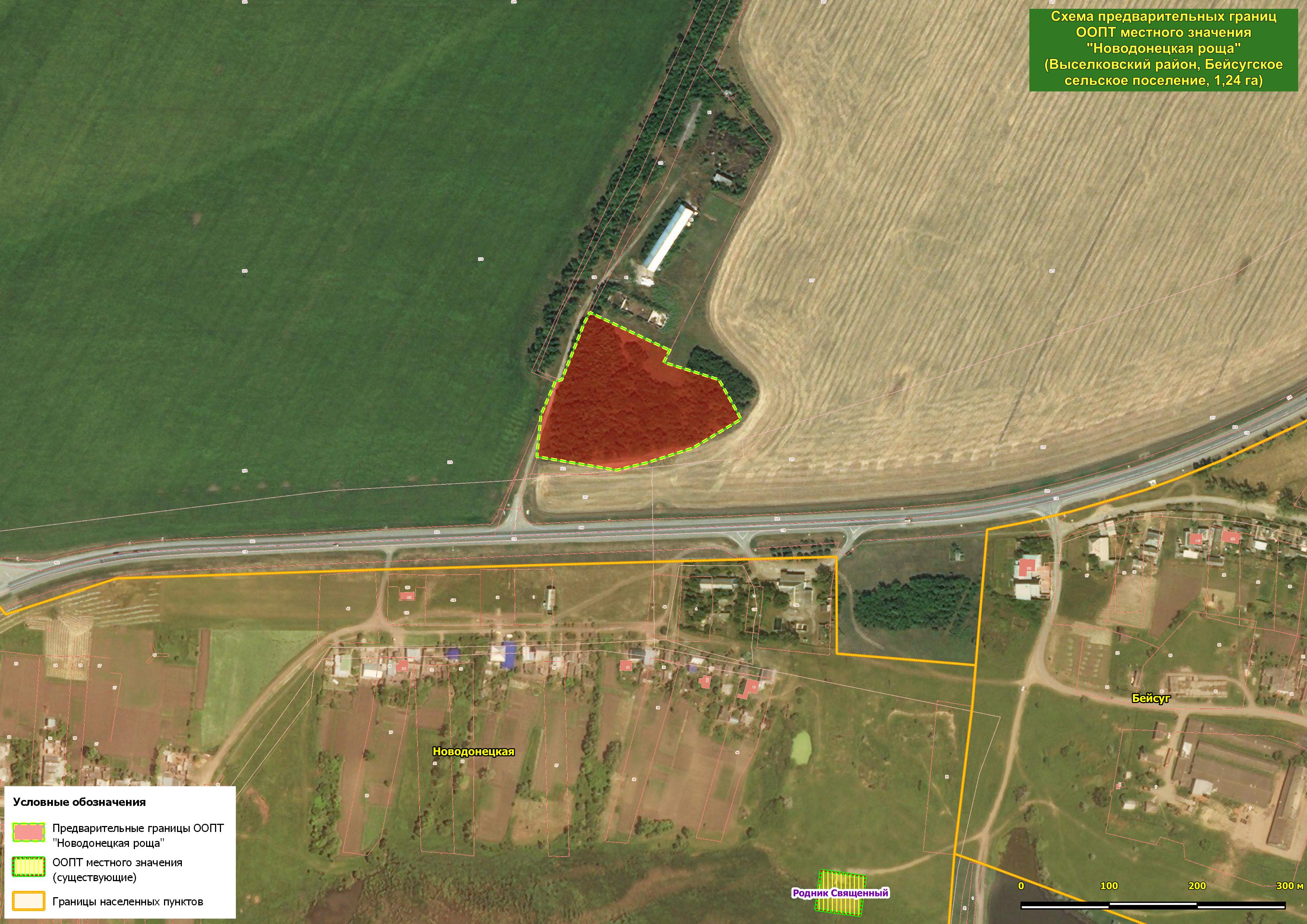 "Новодонецкая роща" (площадь 1,24 га) находится севернее автотрассы на город Тихорецк, Это старая шелковичная посадка, загущенная, с большим количеством сухих, больных и выпавших деревьев. Также в рощу проникают и распространяются ясень пенсильванский и обыкновенный, гледичия трёхколючковая, каркас западный, дикие плодовые (махалебка обыкновенная, абрикос и алыча); произрастают кустарники бузина чёрная, свидина, по краям тёрн. В северной части рощи расположен курган, покрытый степной растительностью. Новодонецкая роща, как почти все озеленённые территории в населённых пунктах, испытывает значительный прессинг человеческой деятельности: с севера к ней примыкает свалка строительного и древесного мусора, возле трассы её территория сокращается и происходит строительство коммерческих объектов. Эти проблемы, как и неудовлетворительное состояние древостоя с необходимостью прочистки, уборки мусора и подсадки естественных видов типа дуба черешчатого, требуют внимания местных органов власти.